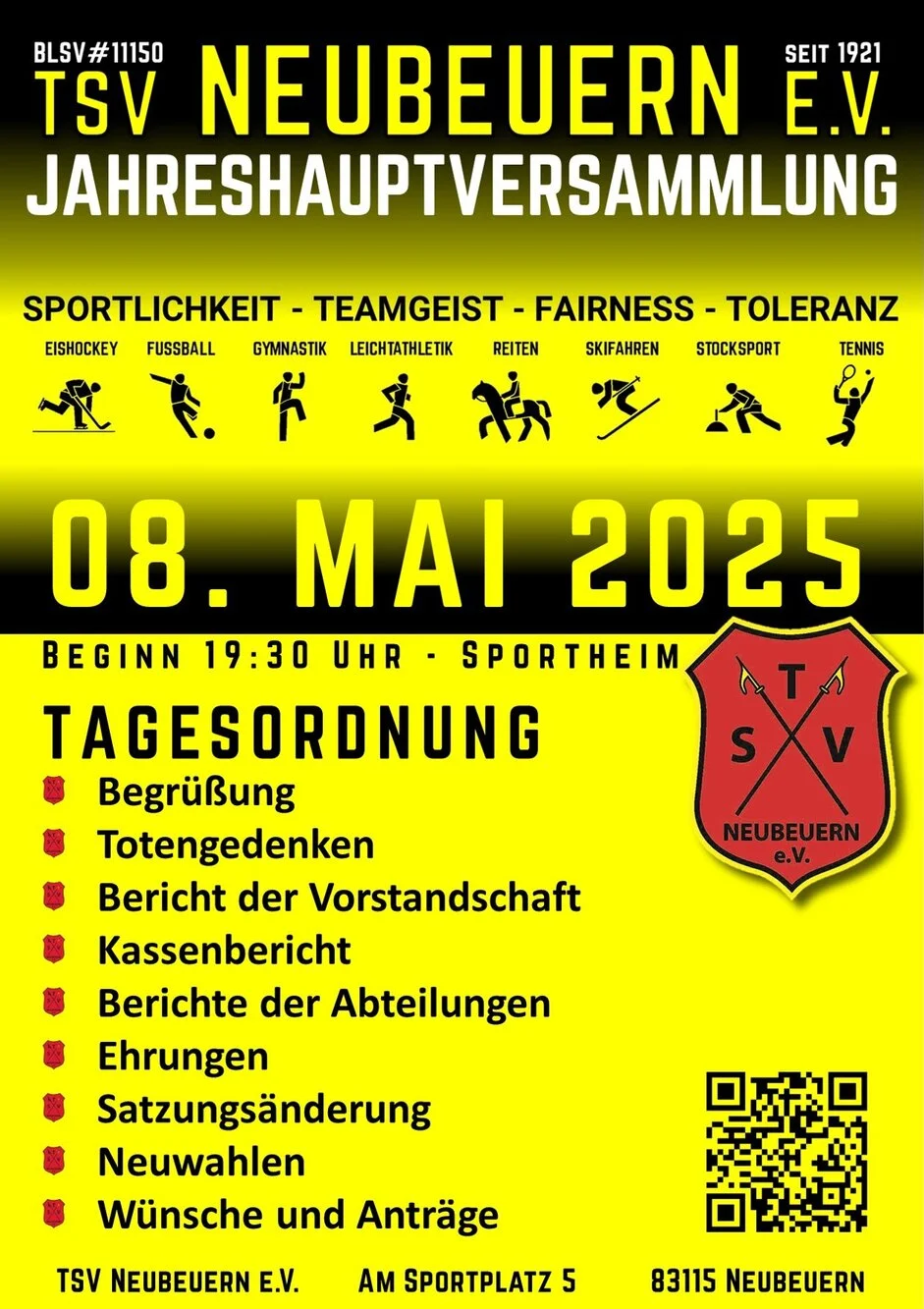 Die nächste Jahreshauptversammlung des TSV Neubeuern findet am 8. Mai 2025 um 19:30 Uhr im Sportheim statt.
